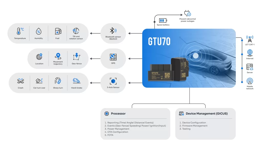 The GTU70 OBD gps tracker is a compact and convenient GPS tracking device that plugs directly into a vehicle’s OBD port—no tools or wiring required. Designed for ease of use, it is commonly employed by businesses to reduce insurance costs, optimize fuel and travel efficiency, and enhance vehicle usage monitoring.